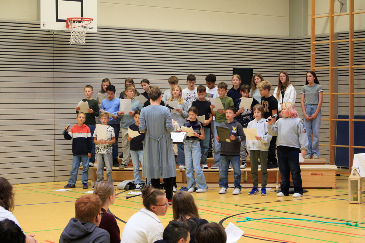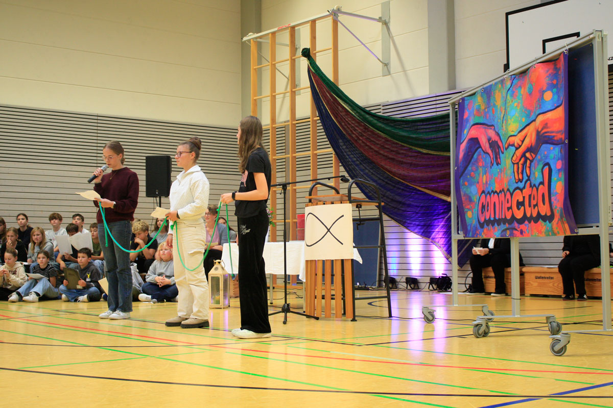 Unter diesem Motto stand die Besinnung zum Schuljahresanfang der Fachschaften Religion und Ethik. Gleichzeitig bleibt es das Motto des gesamten Schuljahres, denn nur gemeinsam kann man manche Herausforderungen meistern, nur gemeinsam lohnt es sich, durch den Alltag zu gehen. Auch die Beiträge zur Besinnung folgen diesem Motto: „Verbundenheit“, gesungen von Frau Eckhoff-Fieber gemeinsam mit der Klasse 6c, „Count on me“ von Bruno Mars und „Wir sind groß“ von Mark Forster. Auf geht´s in ein gemeinsam gestaltetes Schuljahr.